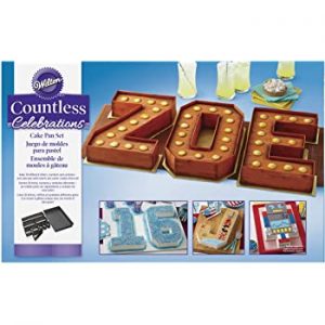 It’s as easy as 1-2-3 to customize any party to celebrate every special occasion. Use a pan to bake cakes shaped like the letters AZ and numbers 0-9, perfect for celebrating birthdays, anniversaries, engagements, and more. The celebration numbers and letters skillet set to celebrate every special occasion. The full set includes a 14.5 x 9-inch nonstick pan, with a grid guide bottom, 8 pan inserts, an angle cutter, and easy-to-photograph instructions.