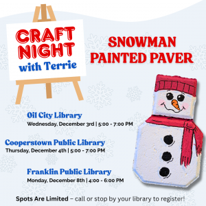 Explore all events, programs, & workshops at Oil Region Libraries. Filter by category & location to find events for a certain age-range or at a specific library. All events, programs, & workshops are free to attend unless stated otherwise & do not require a library card.