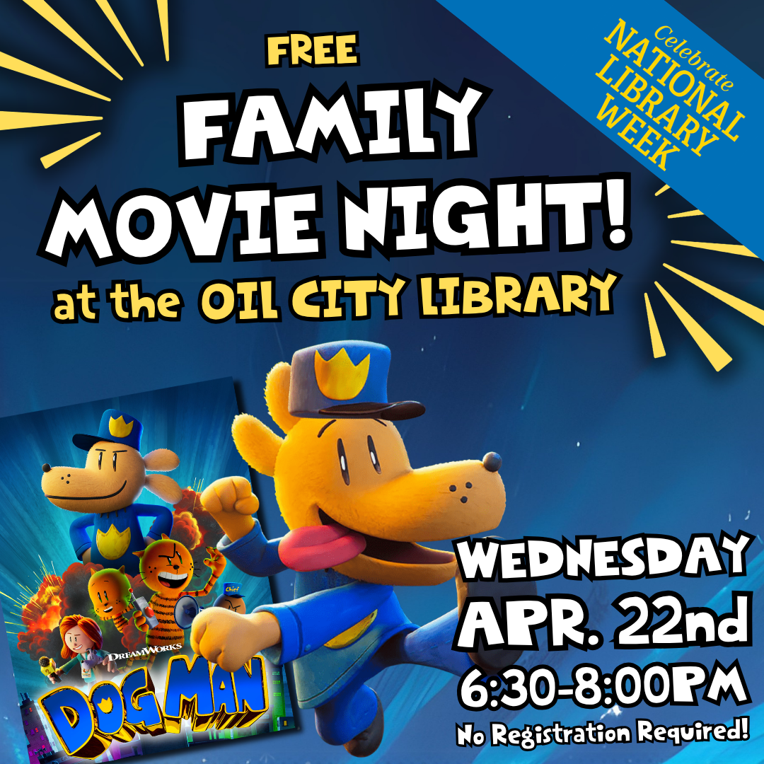 Families are invited to join us in Oil City’s Library Hall for a free screening of the canine crime-fighting film adaptation of Dav Pilkey’s literary phenomenon: Dog Man. Part dog, part man, all hero! Free popcorn provided to all participants.