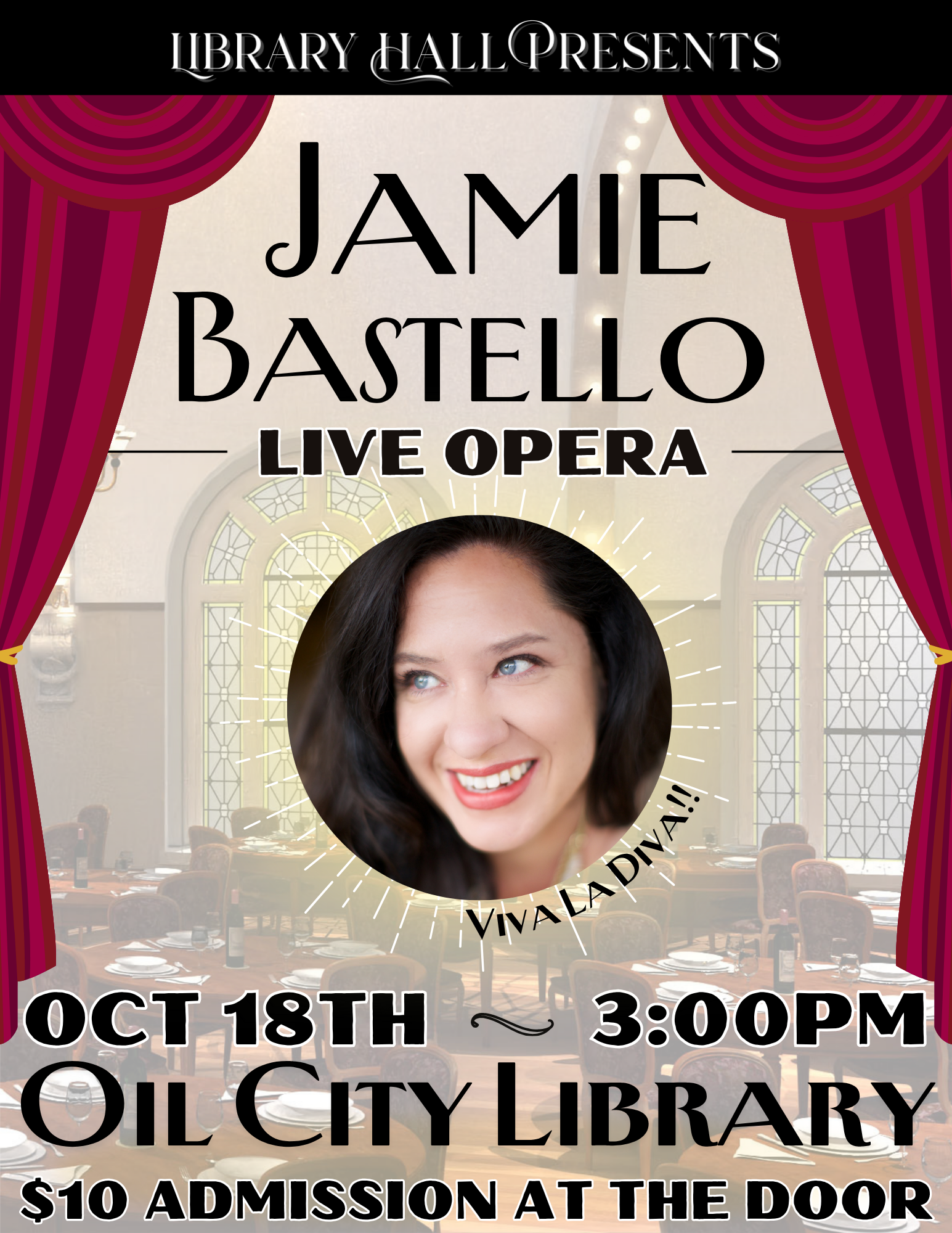 Join us at the Oil City Library on Saturday, October 18th at 3:00PM for a LIVE opera performance by local opera singer Jamie Bastello in the library’s newly restored upstairs historic theater, Library Hall! The performance is sure to be unique, as the library’s historic theater features curved walls for optimal acoustics.