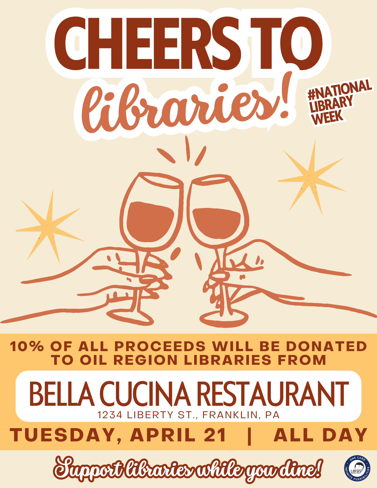 10% of all proceeds from meals & drinks at Bella Cucina Restaurant in Franklin will be donated to Oil Region Libraries. Grab a meal with a friend while supporting your library! Bella Cucina is located at 1234 Liberty St., Franklin.